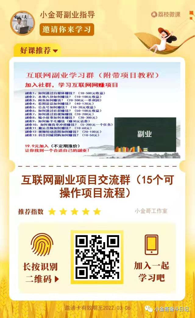 我是小金哥,专注于互联网副业指导。如果你在做副业的过程中遇到什么问题,也可以一起交流。
